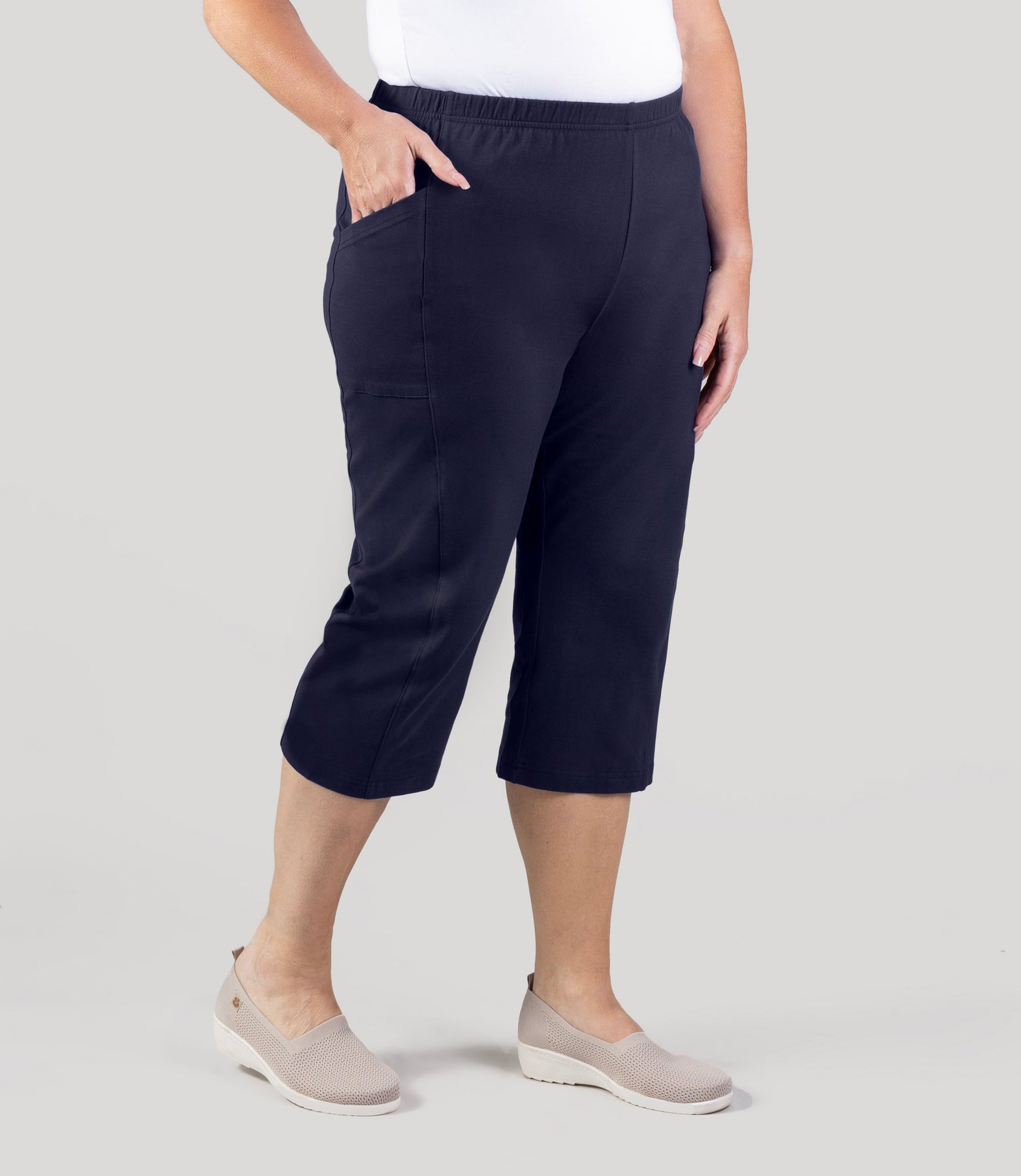 Plus size model, facing back, wearing Stretch Naturals Side Pocket Capri Classic Colors in color dark navy.