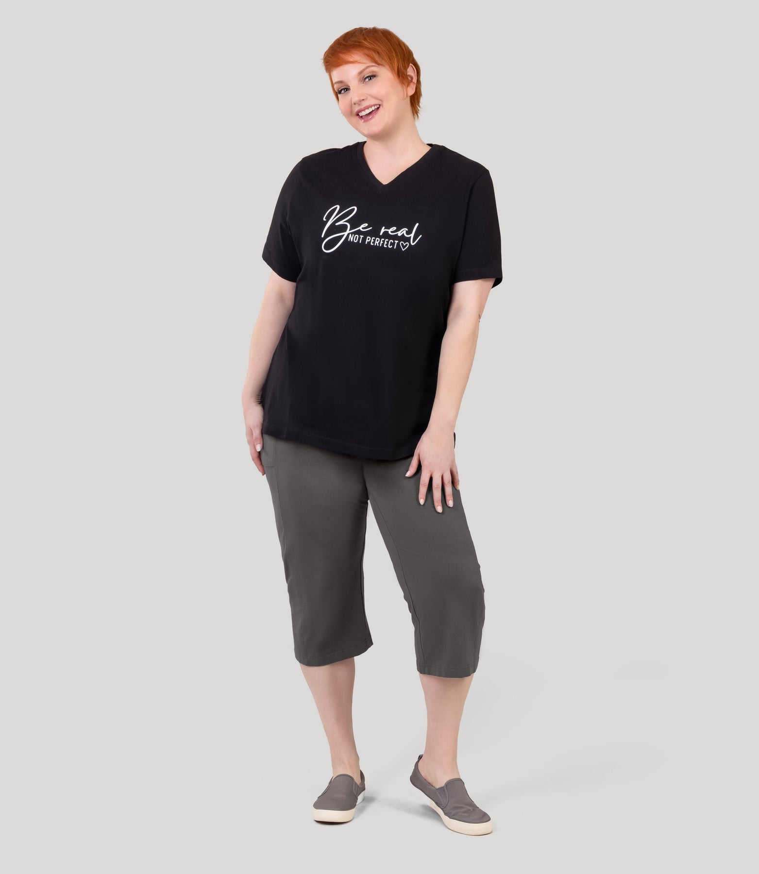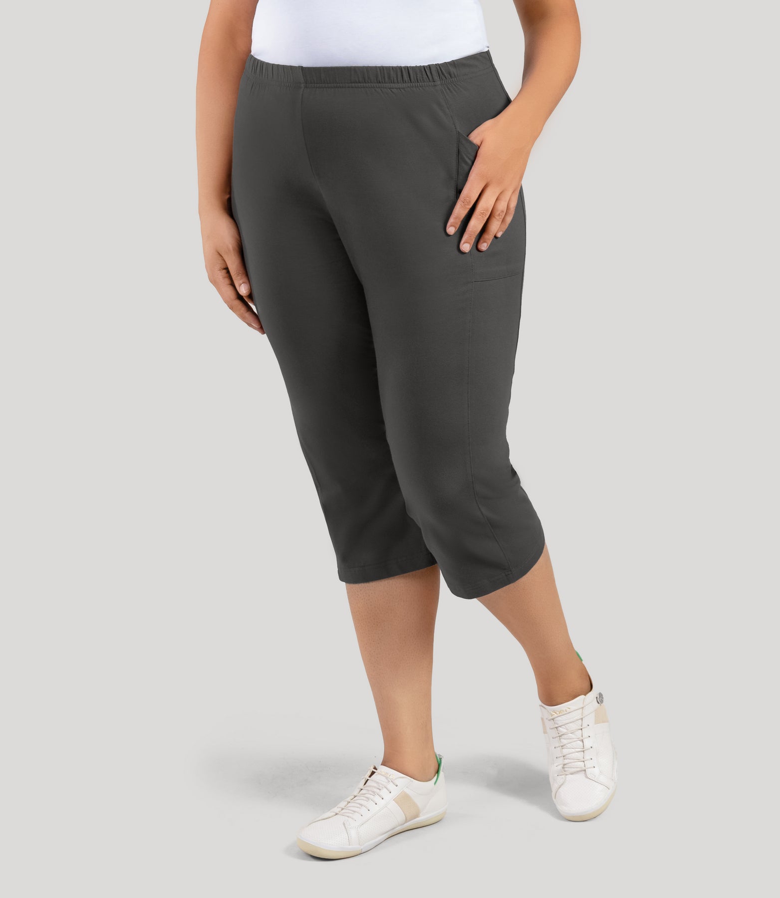 Plus size model, facing front, wearing Stretch Naturals Side Pocket Capri Classic Colors in color deep taupe.